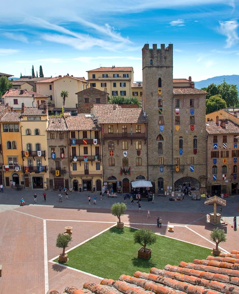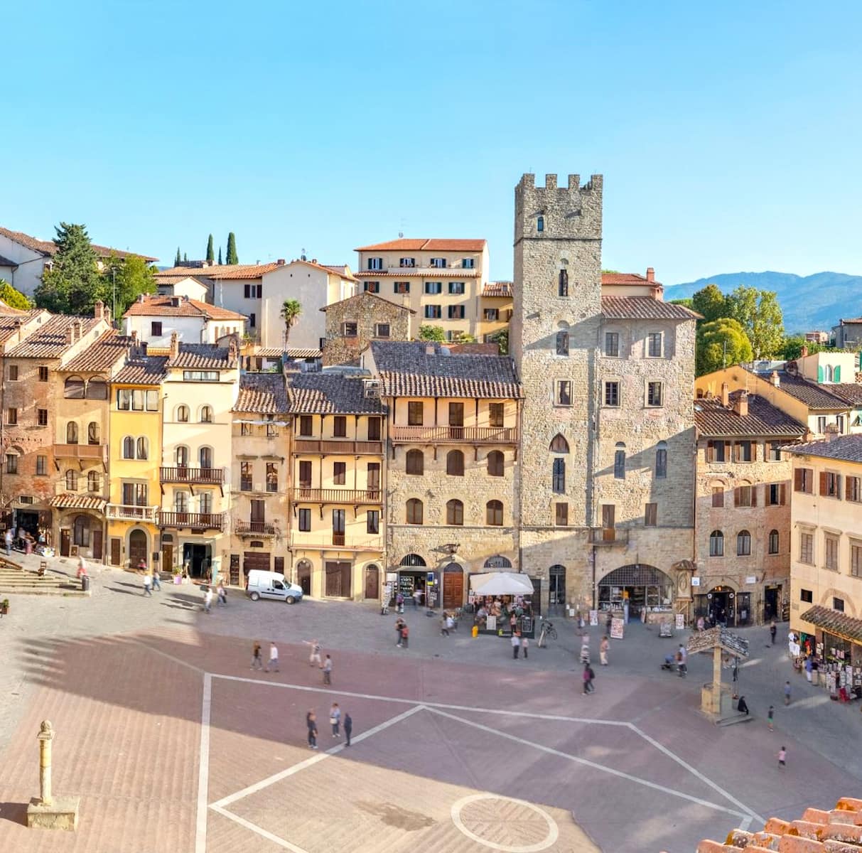 Surrounding treasures. The square is bordered by impressive structures including the elegant Logge del Vasari (designed by Renaissance master Giorgio Vasari) on the north side, the apse of Santa Maria della Pieve with its decorative arches, and the beautiful Palazzo della Fraternita dei Laici with its striking clock tower. Medieval stone buildings line the eastern edge, including the 13th-century crenelated Torre Faggiolana and the Cofani-Brizzolari palace.