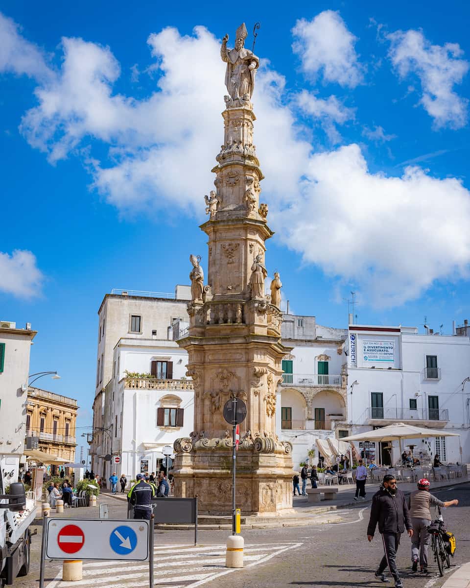 St. Oronzo Square. The heart of the city, this square features a statue of St. Oronzo atop a Roman column (reportedly donated by Brindisi), erected between 1666 and 1683 to thank the saint for his intercession during the plague. The square is surrounded by historic buildings including the Palazzo del Seggio (built in 1592) and contains a portion of a Roman amphitheater that creates a fascinating contrast between antiquity and the present day.