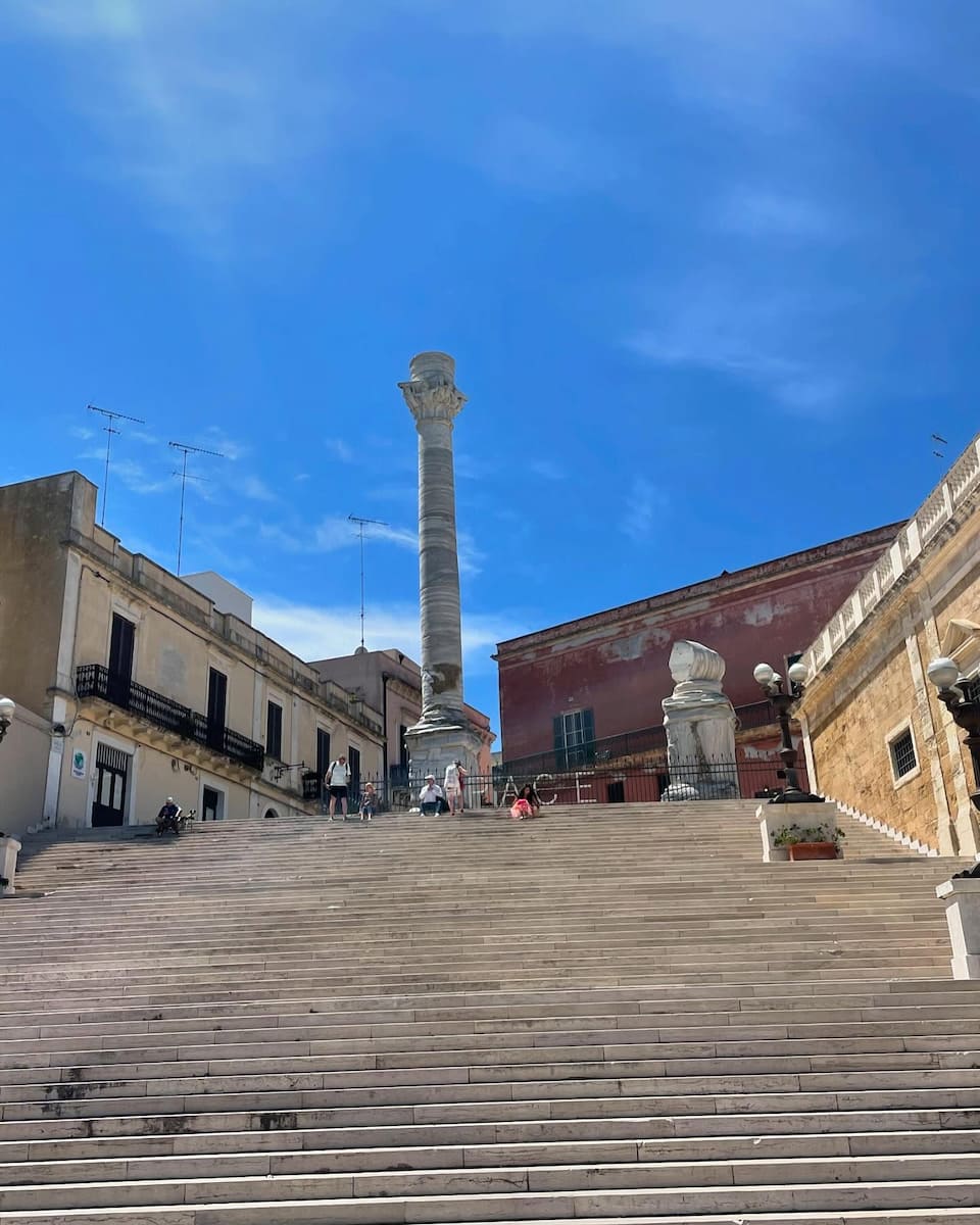 Ancient landmarks. Standing at the top of the wide staircase on the seafront, I gazed at the iconic Roman Columns marking the end of the Appian Way. Only one original column remains, while its twin was gifted to Lecce in 1666 and replaced with a replica.