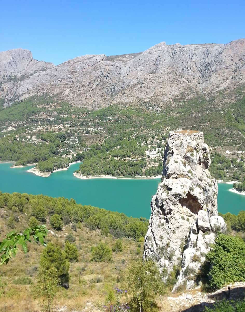 Guadalest Reservoir. Known as the Emerald Jewel, the reservoir below the village is surrounded by mountains and offers a scenic hiking route with abundant vegetation. It’s a peaceful spot for a walk or a picnic, with the castle and bell tower visible above.