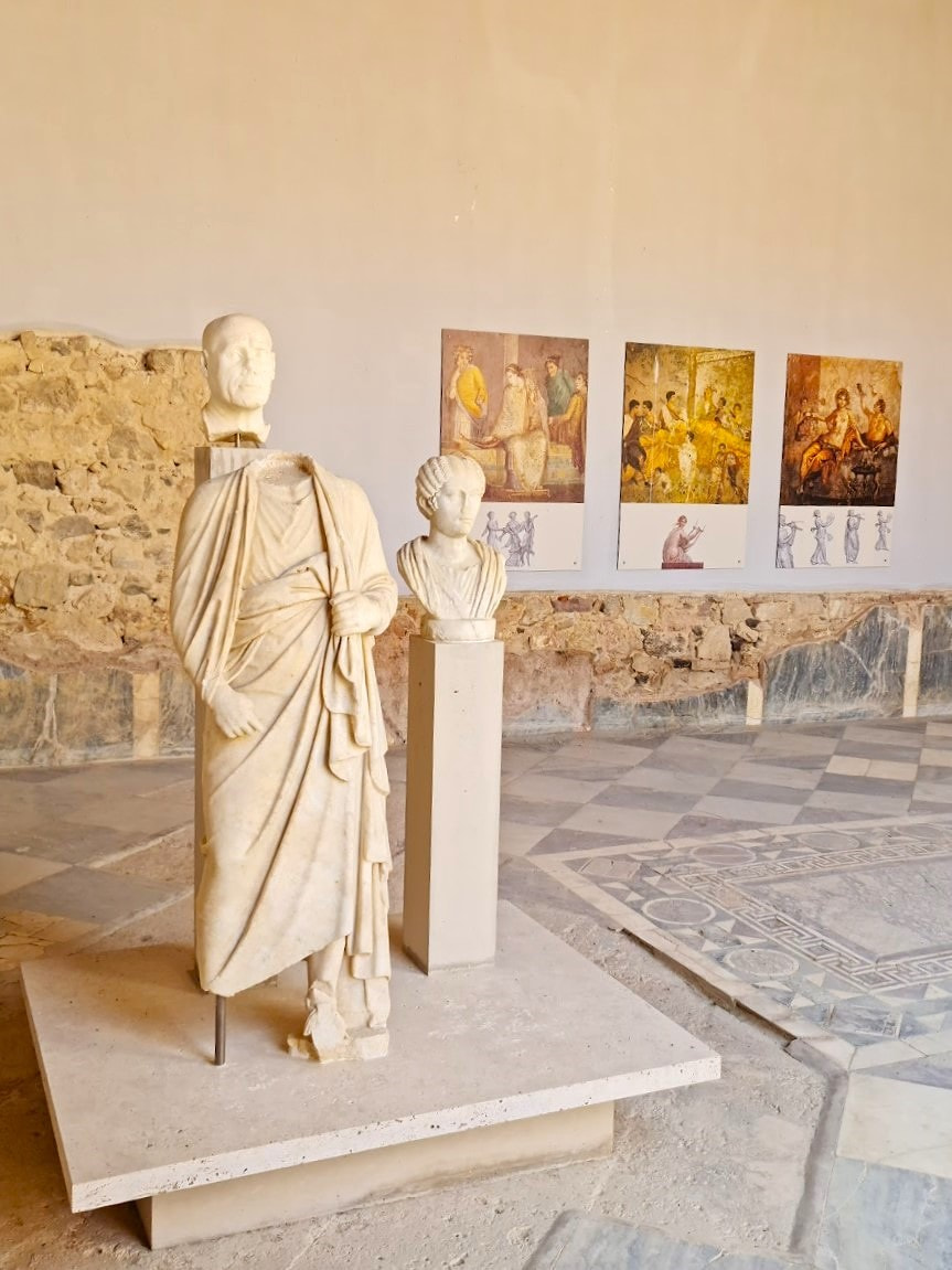 Museum layout. The ground floor and atrium display the most significant sculptures and mosaics. I spent time in the western hall admiring statues from the Hellenistic era, many of which were found stored in the underground arch tunnels of the Roman Odeon. The eastern hall houses impressive statues from the Roman era, including a sitting Hermes and a statue of Demetra.