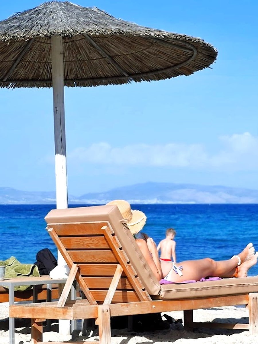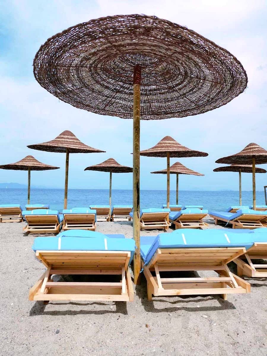 Beach amenities. Sunbeds with umbrellas cost around €8-10 ($8.80-11) for the day, though I found free spots to lay my towel further from the organized sections. The beach bars serve cold drinks (€4/$4.40 for a beer) and light meals (€8-12/$8.80-13.20 for a Greek salad or sandwich).