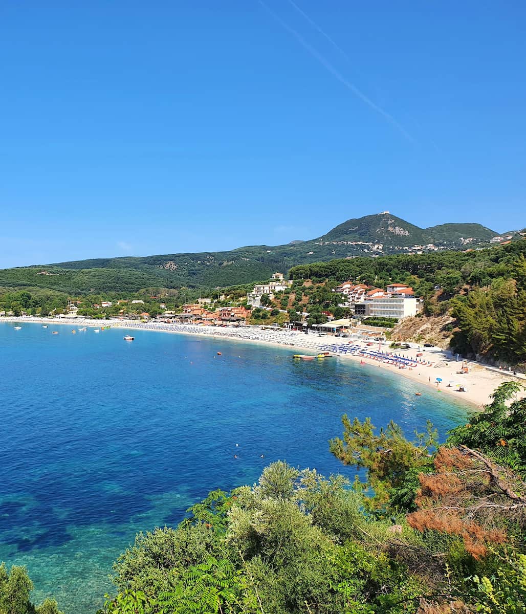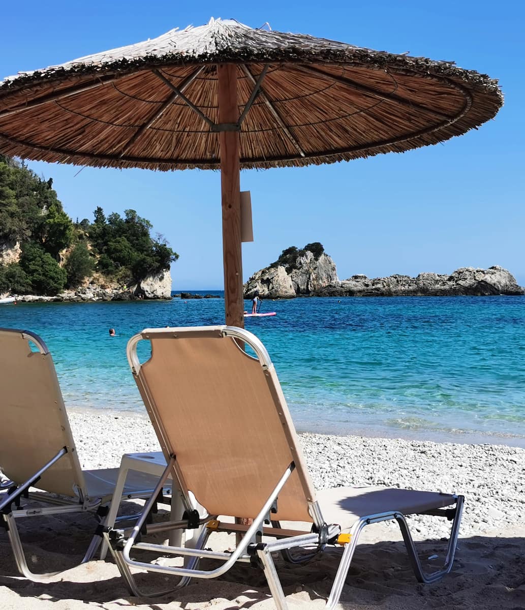 Central Oasis. Just steps from Parga’s bustling town center lies Krioneri Beach, a perfect example of why you don’t need to spend money to enjoy the best of Greek coastal life. During my week-long stay, this became my go-to morning spot – a place to enjoy my coffee while watching the town slowly come to life. What surprised me most was finding such a clean, well-maintained beach right in the heart of town. The crescent of golden sand curves gently around crystal-clear waters, with views of the islet of Panagia and its iconic white chapel just offshore.