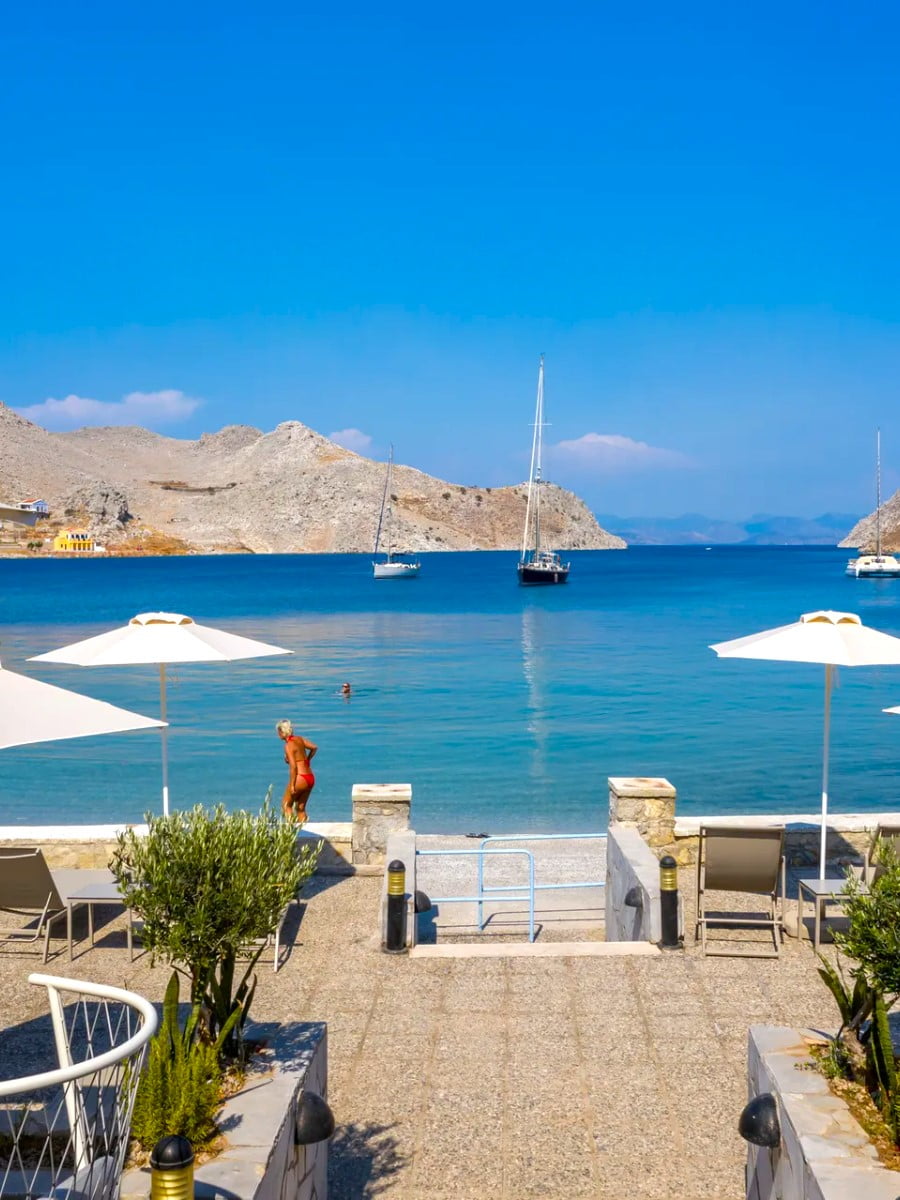 Nanou Beach is only accessible by taxi-boat from the port of Symi or by a long walk. The journey by boat takes about 30–45 minutes and brings you to a beautiful bay with blue waters and sunbeds.
