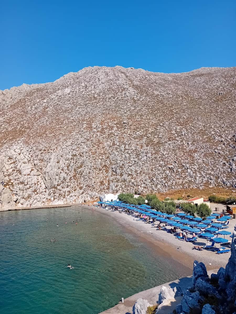 Beach Features. This organized pebble beach is famous for its crystal-clear turquoise water, perfect for swimming, snorkeling, and sunbathing. Sunbeds are available, often for free if you dine at the taverna.